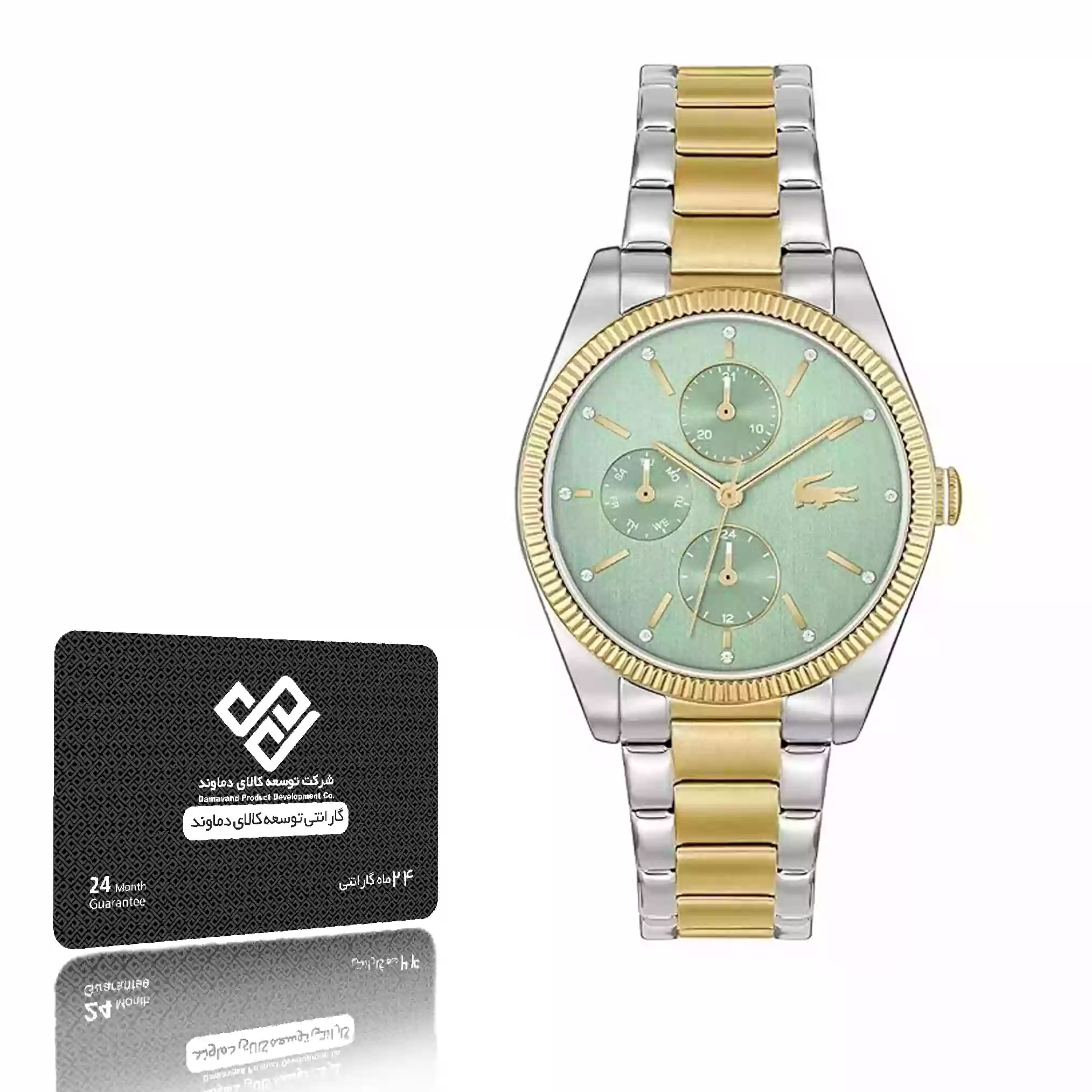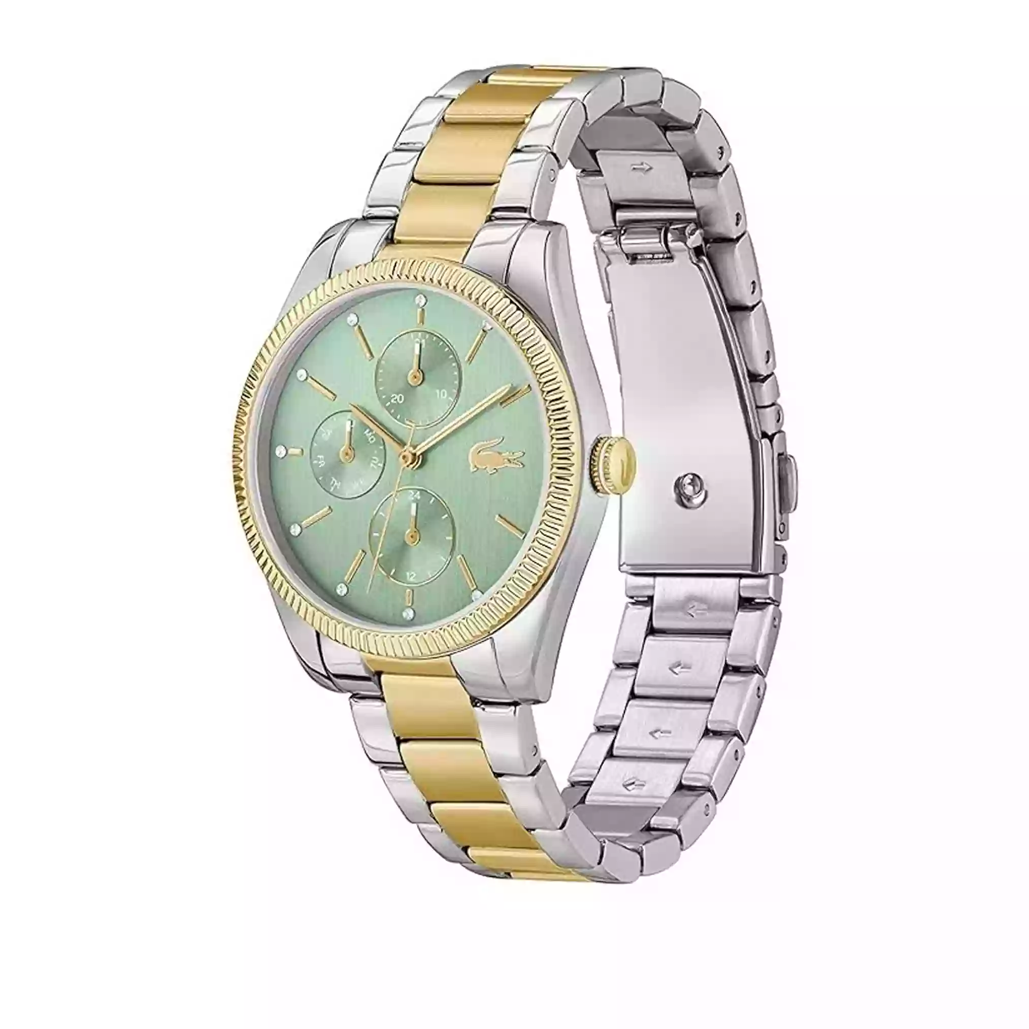 اگر دنبال ساعتی هستید که هم در محیط کار و هم در مهمانیها بدرخشد، لاگوست (Lacoste) مدل 2001364 انتخابی عالی است. این مدل با بدنه و بند فلزی استیل دو رنگ (نقرهای و طلایی)، صفحه سبز روشن و طراحی کلاسیک، توجهها را جلب میکند. قطر ۳۶ میلیمتری آن ظاهری زنانه و متناسب با مچ دست ایجاد میکند. موتور کوارتز دقیق، نمایش تاریخ و روز، و مقاومت ۵ ATM ویژگیهایی هستند که این ساعت را برای استفاده روزمره یا رسمی مناسب میکند.