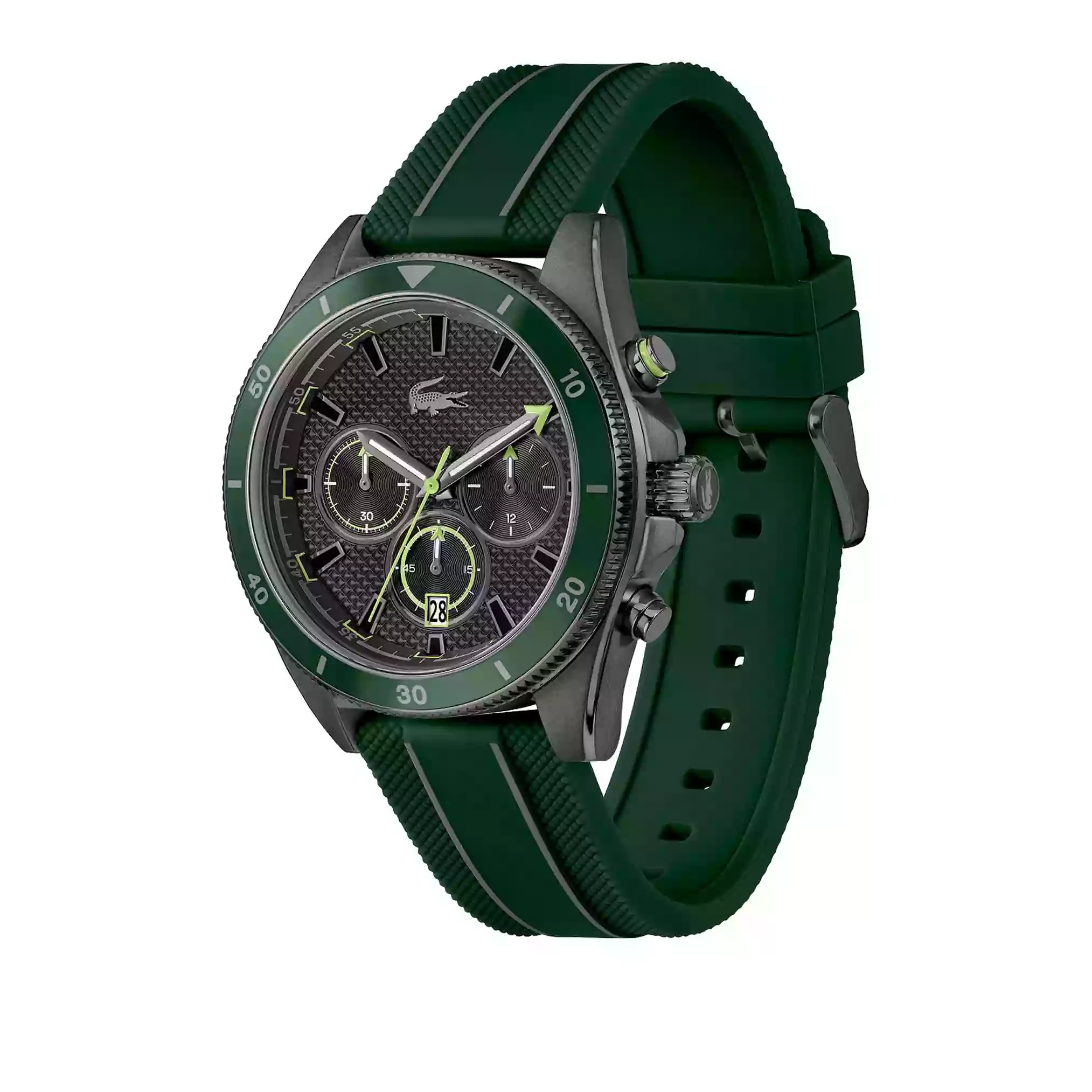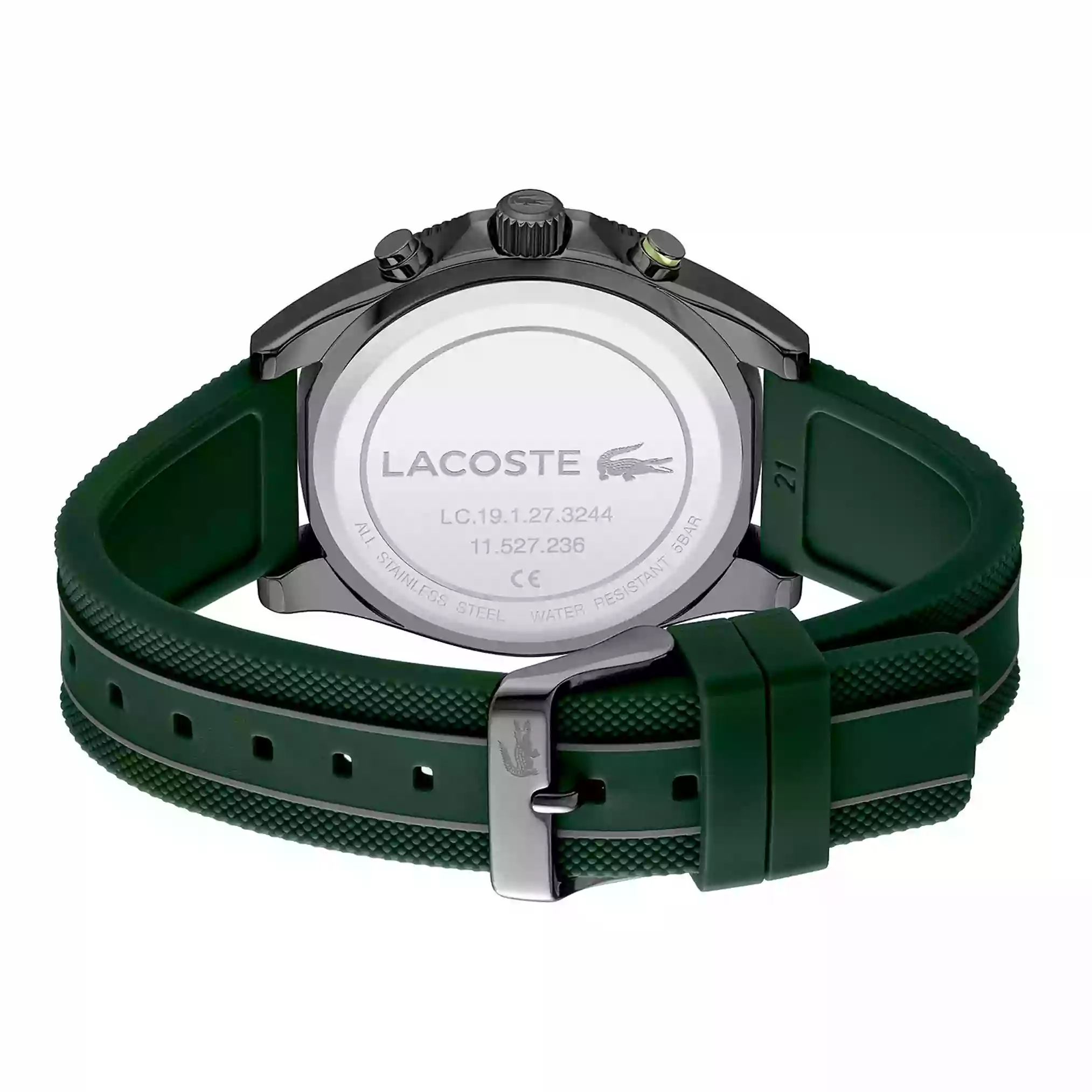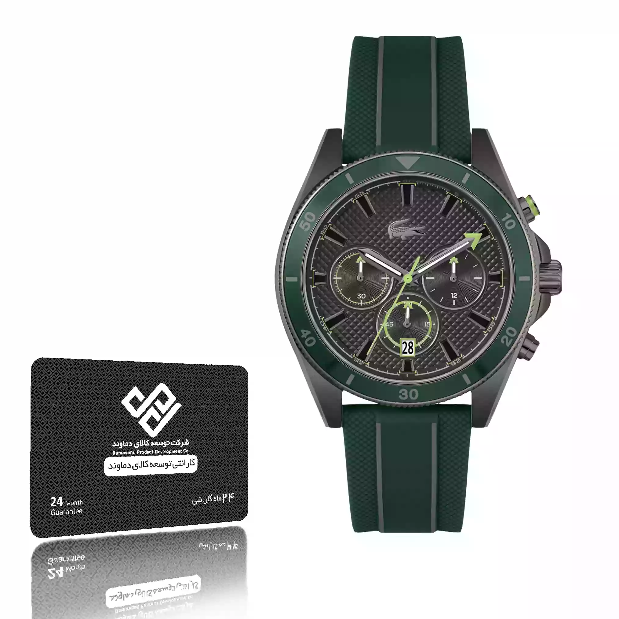 ساعت مردانه لاگوست (Lacoste) مدل 2011363 دارای طراحی ورزشی و مدرن است که با بند سیلیکونی سبز رنگ و قاب به رنگ فِیم / گرافیتی میتواند بهراحتی با استایلهای اسپرت یا کژوال ست شود. رنگ سبز بند باعث میشود این ساعت برای کسانی که به جذابیت بصری اهمیت میدهند، گزینهای چشمنواز باشد.